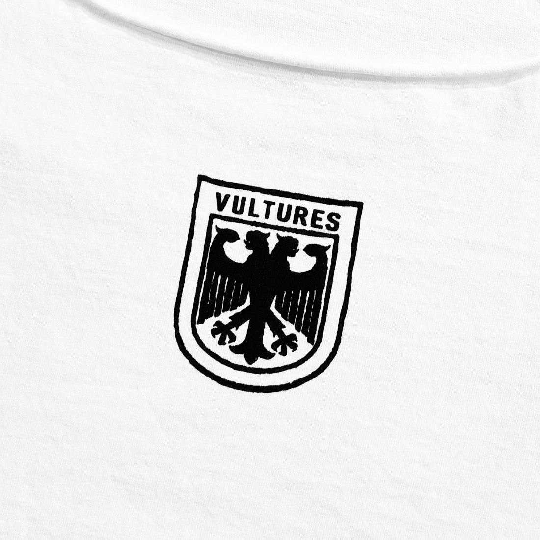 首元、袖口、裾口の全てが切りっぱなしで制作され、フロント、バックにはVULTURESのエンブレムが施されます。