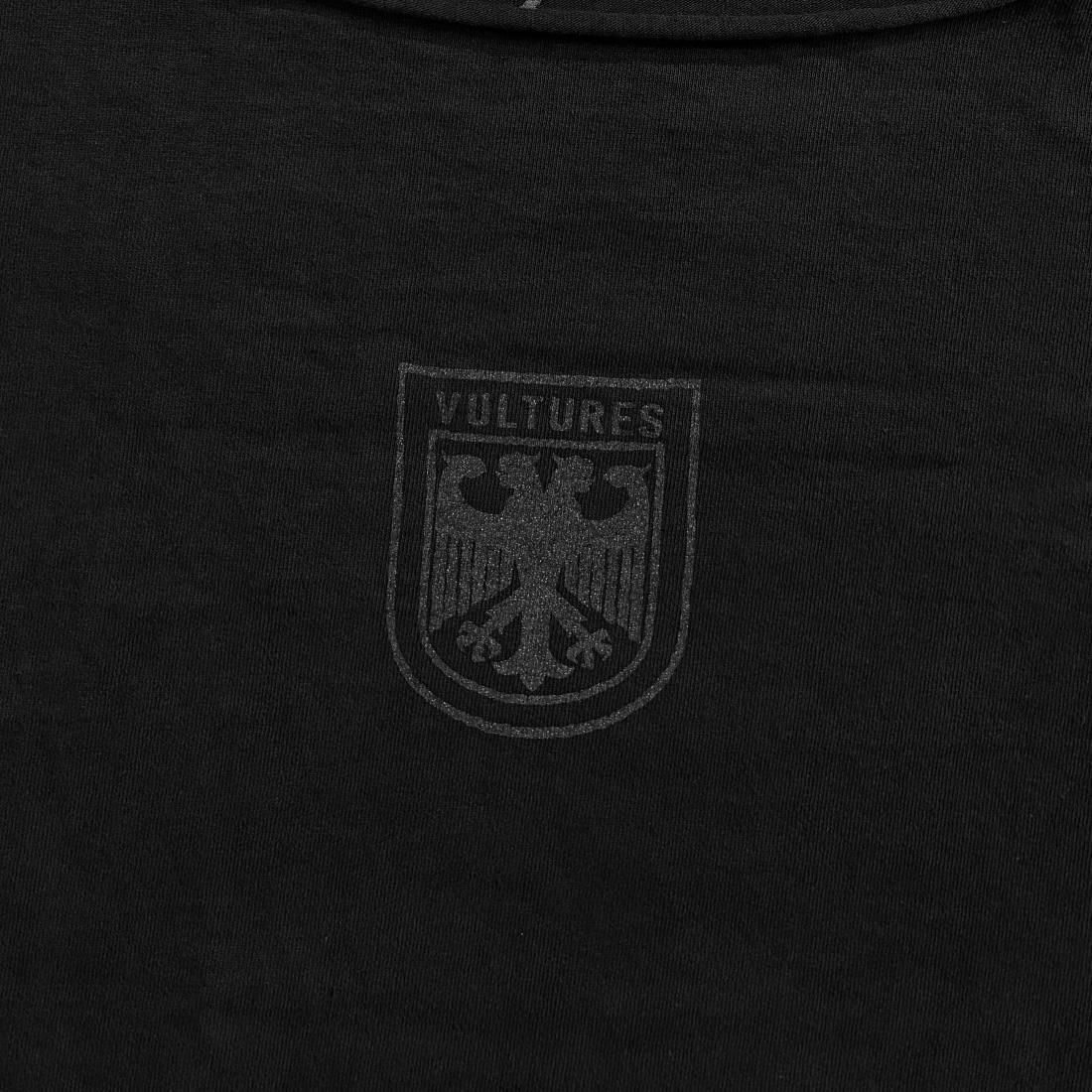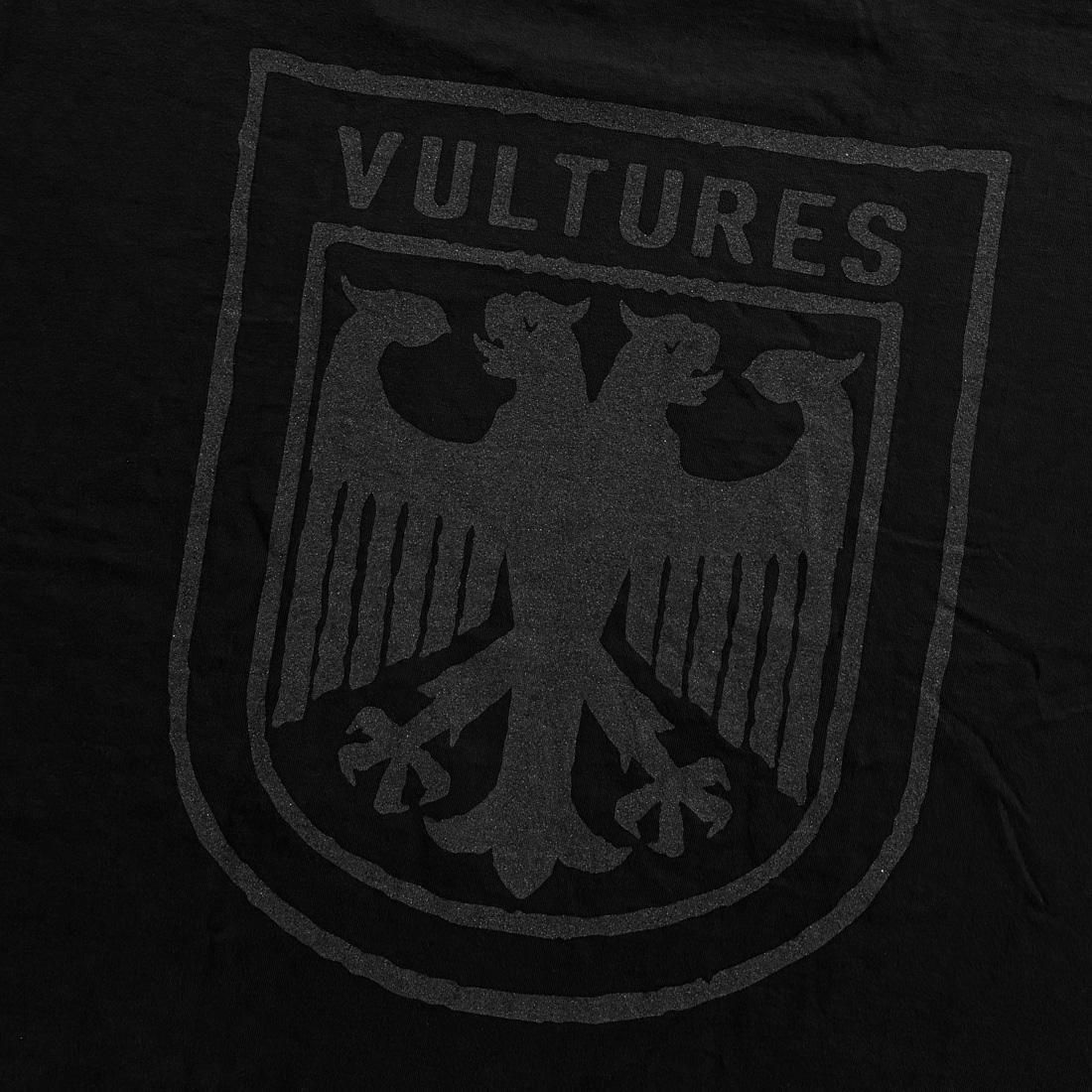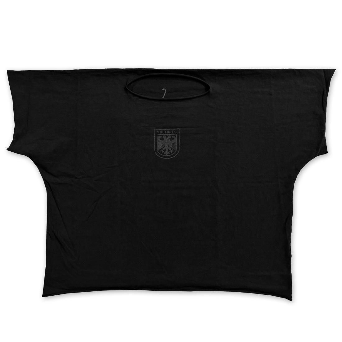 首元、袖口、裾口の全てが切りっぱなしで制作され、フロント、バックにはVULTURESのエンブレムが施されます。
