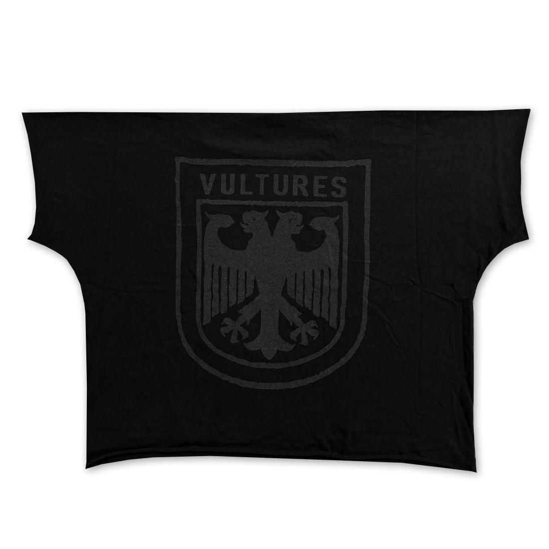 首元、袖口、裾口の全てが切りっぱなしで制作され、フロント、バックにはVULTURESのエンブレムが施されます。