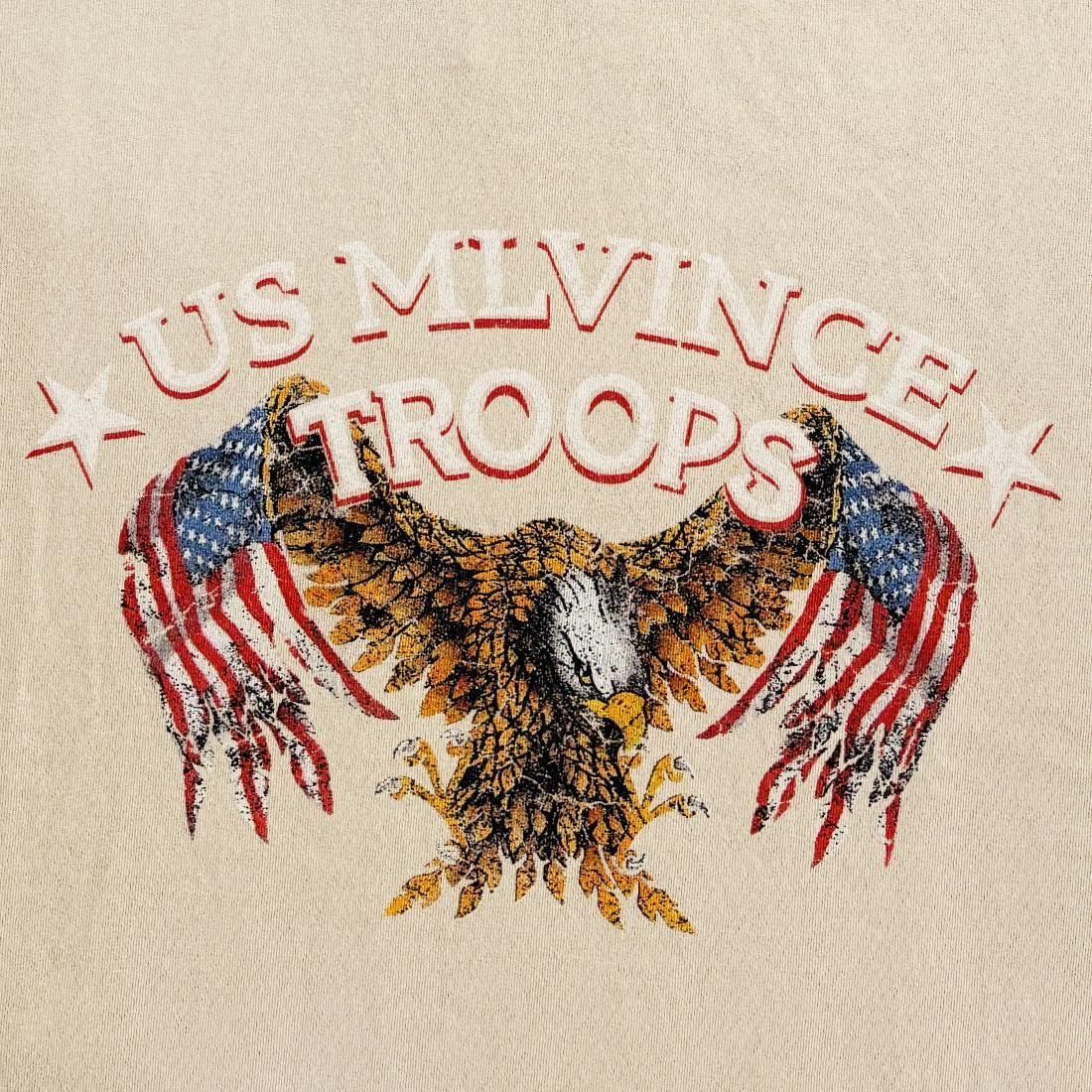 星条旗を纏ったイーグルと「US MLVINCE TROOPS」のレタリングをヴィンテージ調に落とし込み、存在感のある一枚。